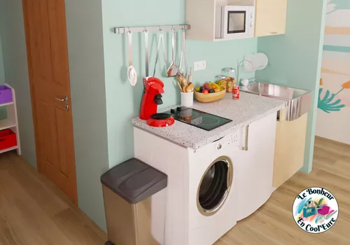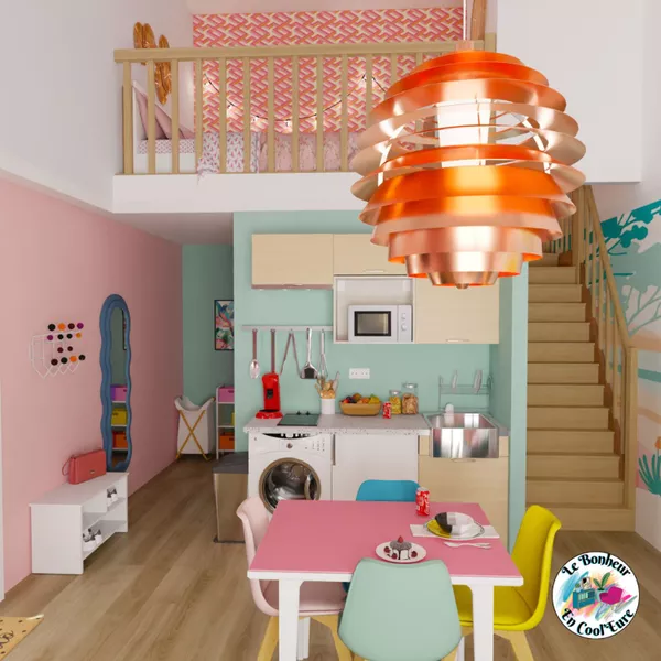 J’ai imaginé une ambiance forte autour d’un mur décoratif avec un poster panoramique illustré, aux couleurs multiples et dynamiques, véritable pièce maîtresse du projet. Ce décor mural sert de fil conducteur à l’ensemble de l’aménagement. Le mobilier et les accessoires ont été soigneusement sélectionnés et adaptés dans une palette rose, vert d’eau, jaune et bleu, afin de créer une cohérence visuelle sans surcharger l’espace.