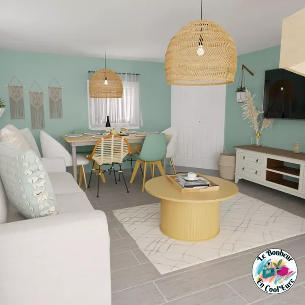 Le choix des meubles en bois clair et blanc apporte une sensation de légèreté et de pureté à l’espace. Ces teintes naturelles s’associent parfaitement à une palette de couleurs douces, composée de vert d’eau et de blanc, sélectionnée pour ses vertus apaisantes et rafraîchissantes. Le vert d’eau invite la nature à l’intérieur et contribue à créer une atmosphère sereine, idéale pour un espace de vie convivial.