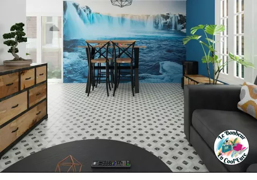 Pour renforcer l’univers graphique et rappeler la passion du client, un poster mural représentant une chute d’eau dans des tons bleus a été intégré, créant un point focal dynamique et immersif.